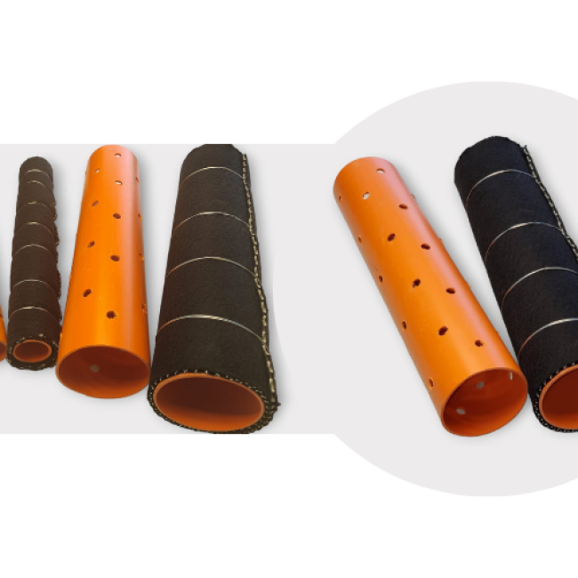 El Geodrén Vial es un sistema de captación, conducción y evacuación de fluidos que está compuesto por un Geotextil No Tejido, una red drenante y tubería de PVC corrugada de drenaje